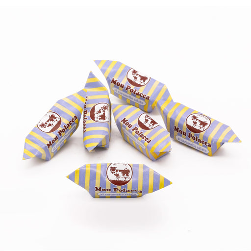 MOU POLACCA AL CARAMELLO SALATO Una Mou Polacca ancora più gustosa e accattivante: il caramello salato infatti crea un armonioso mescolarsi di sapori in bocca. Un tocco di sale per ammorbidire il dolce di questa tradizionale fudge.