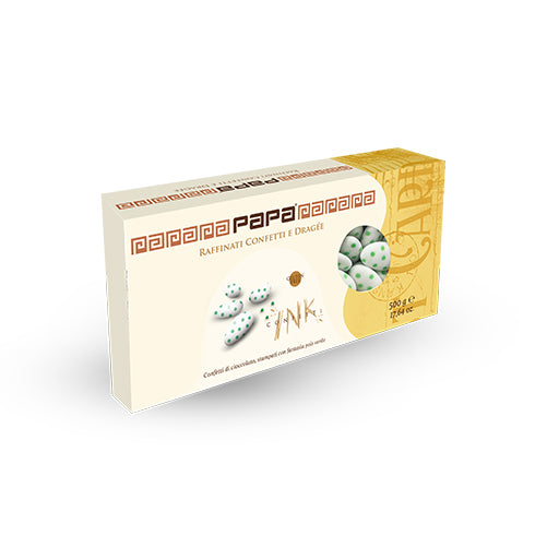 Papa Dolce AmaroConfetti di cioccolato, stampati con fantasia pois verde. Confetti con anima di cioccolato fondente morbido 60% con confettura sottile. Colore bian...