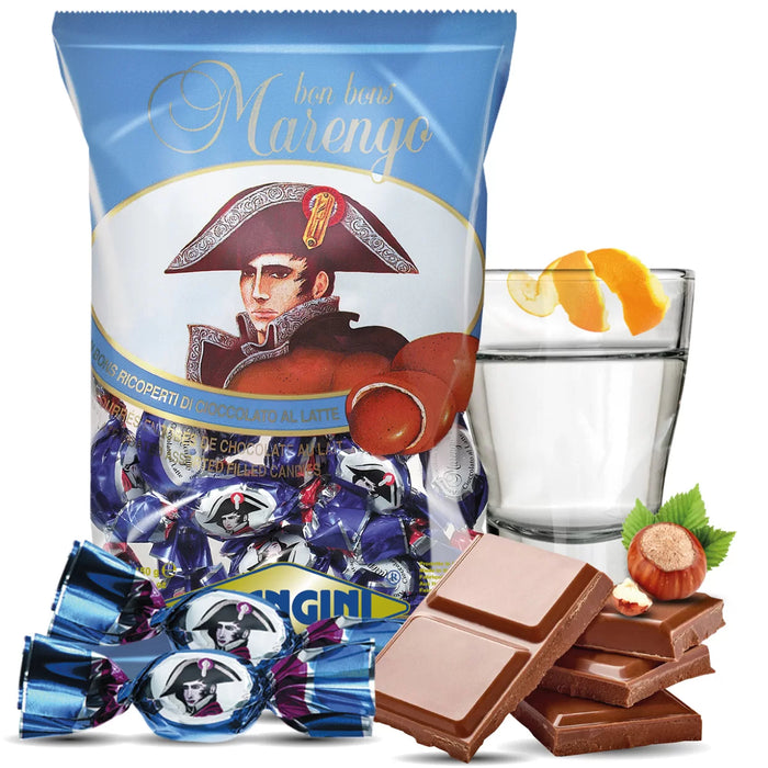 Praline morbidissime ripiene di crema liquorosa al gusto di nocciola e Curaçao, ricoperte di cioccolato al latte.