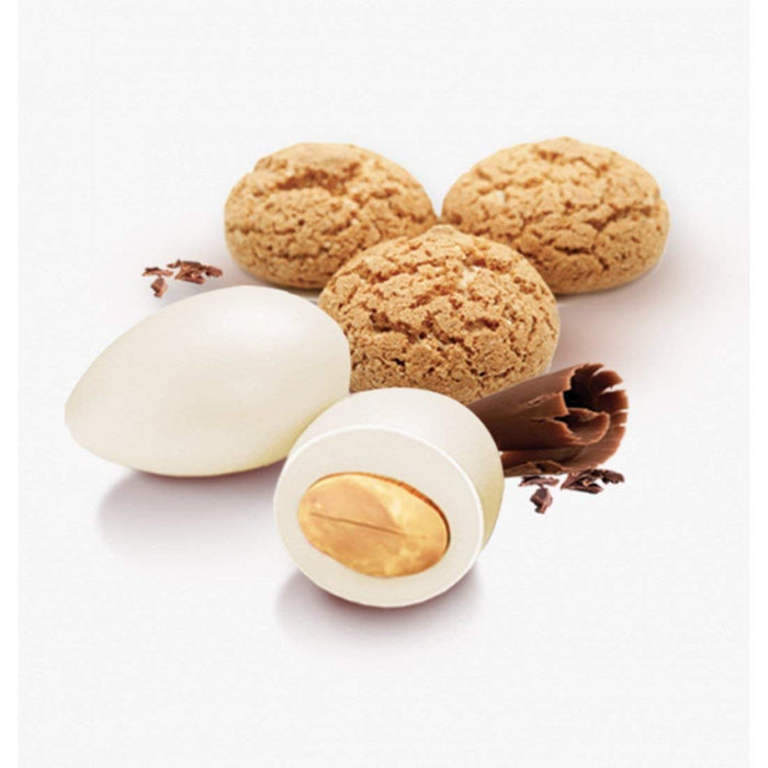 Confetto dragée confettato di color bianco. Mandorla tostata ricoperta di uno strato di cioccolato bianco alla mandorla amara, confettata. Pezzi per confezione 95 circa.