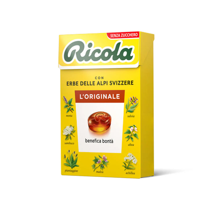 • RICOLA ORIGINALE SENZA ZUCCHERO Dall’inconfondibile gusto alle erbe questa caramella è apprezzata da tempo per la sua balsamicità