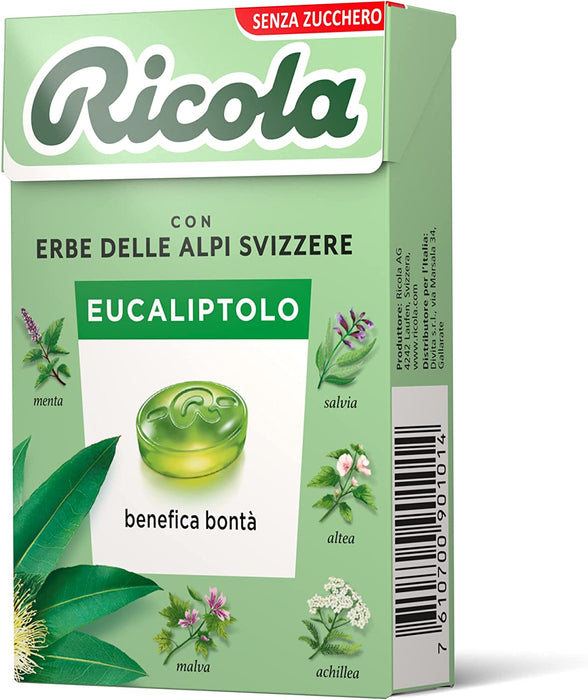 - RICOLA ERBE ALPINE SENZA ZUCCHERO Gli estratti delle foglie di eucalipto uniti al mentolo vanno a rinforzare la tradizionale miscela di 13 erbe. Le caramelle eucaliptolo garantiscono un alito fresco e sono benefiche per la gola