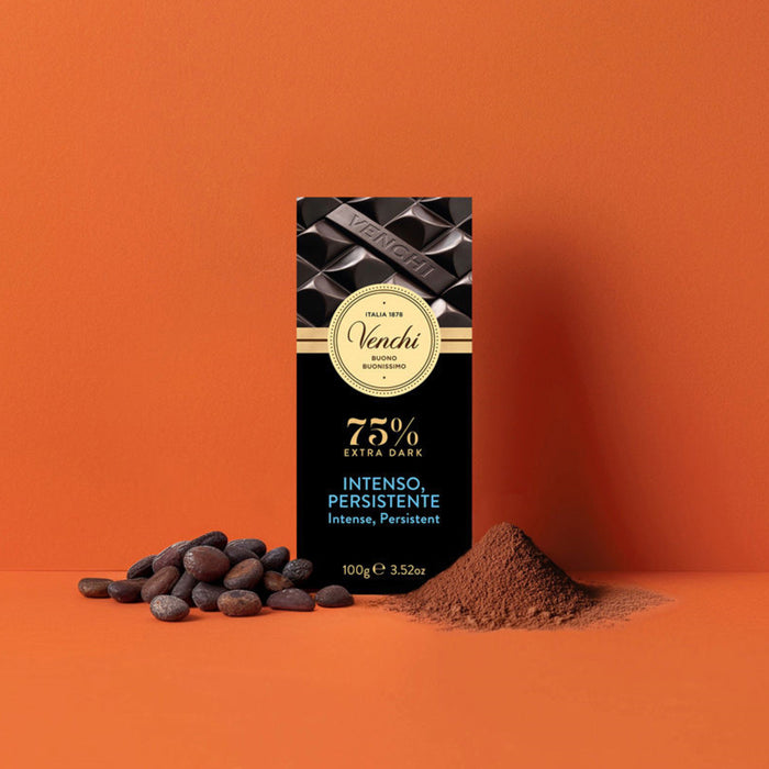 Tavoletta di cioccolato extra fondente 75% intenso, persistente. Naturalmente senza glutine.